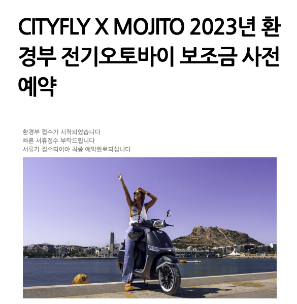 중고차를 살까, 새 스쿠터를 살까 고민하던 차에. 이제 여름이고, 여기저기 가볍게 돌아다니면서 주차 걱정도 안해도 되는 스쿠터 쪽으로 맘이 기울어 버렸다. 그리하야 3월 30일에 시티플라이 홈페이지를 통해 2023년 신형 전기 오토바이 "모히또" 를 사전 예약했다. 사전 예약한 사람은 사은품으로 헬멧을 함께 준다는 말에 얼른 신청해 버림 ㅎㅎㅎ